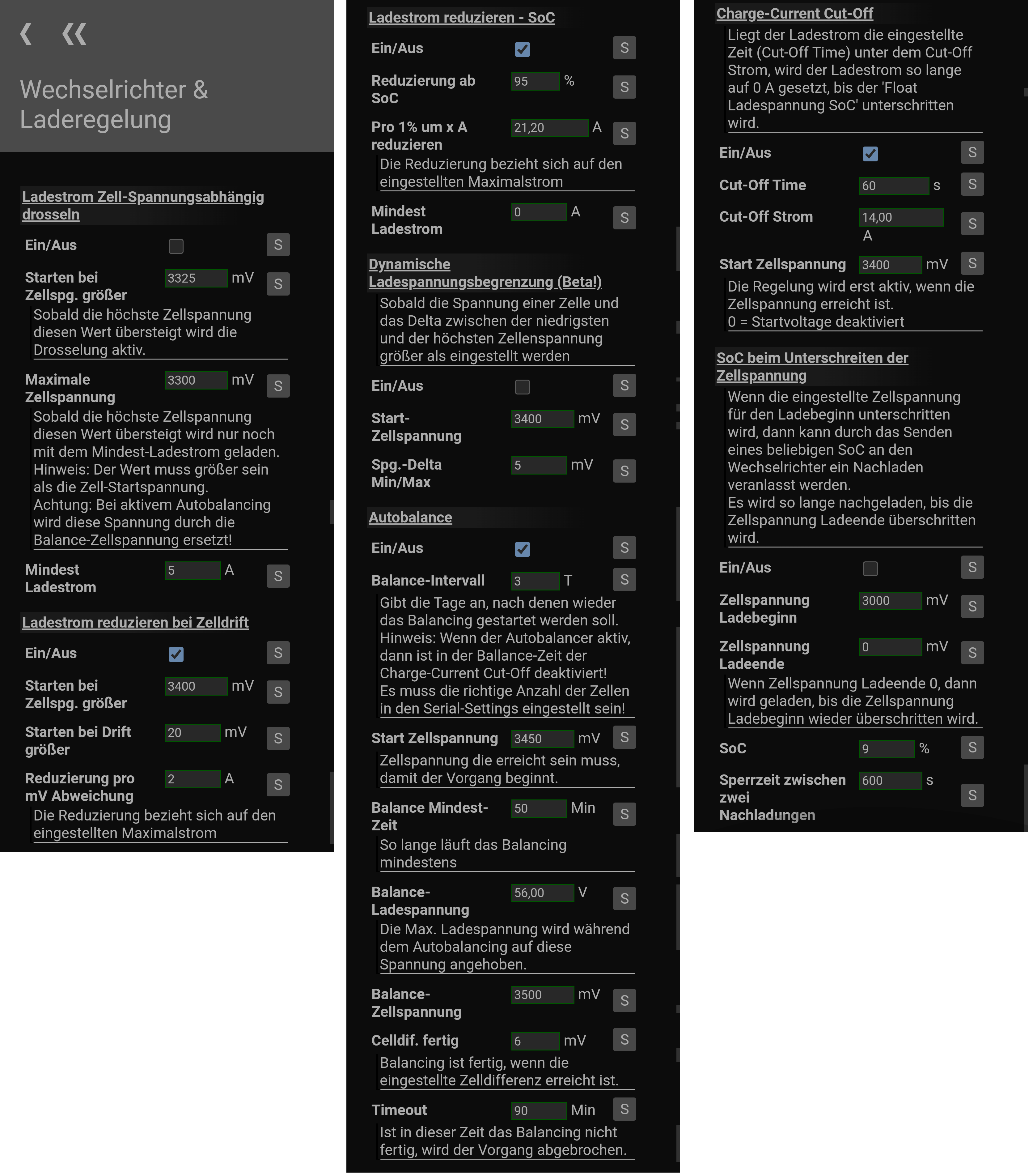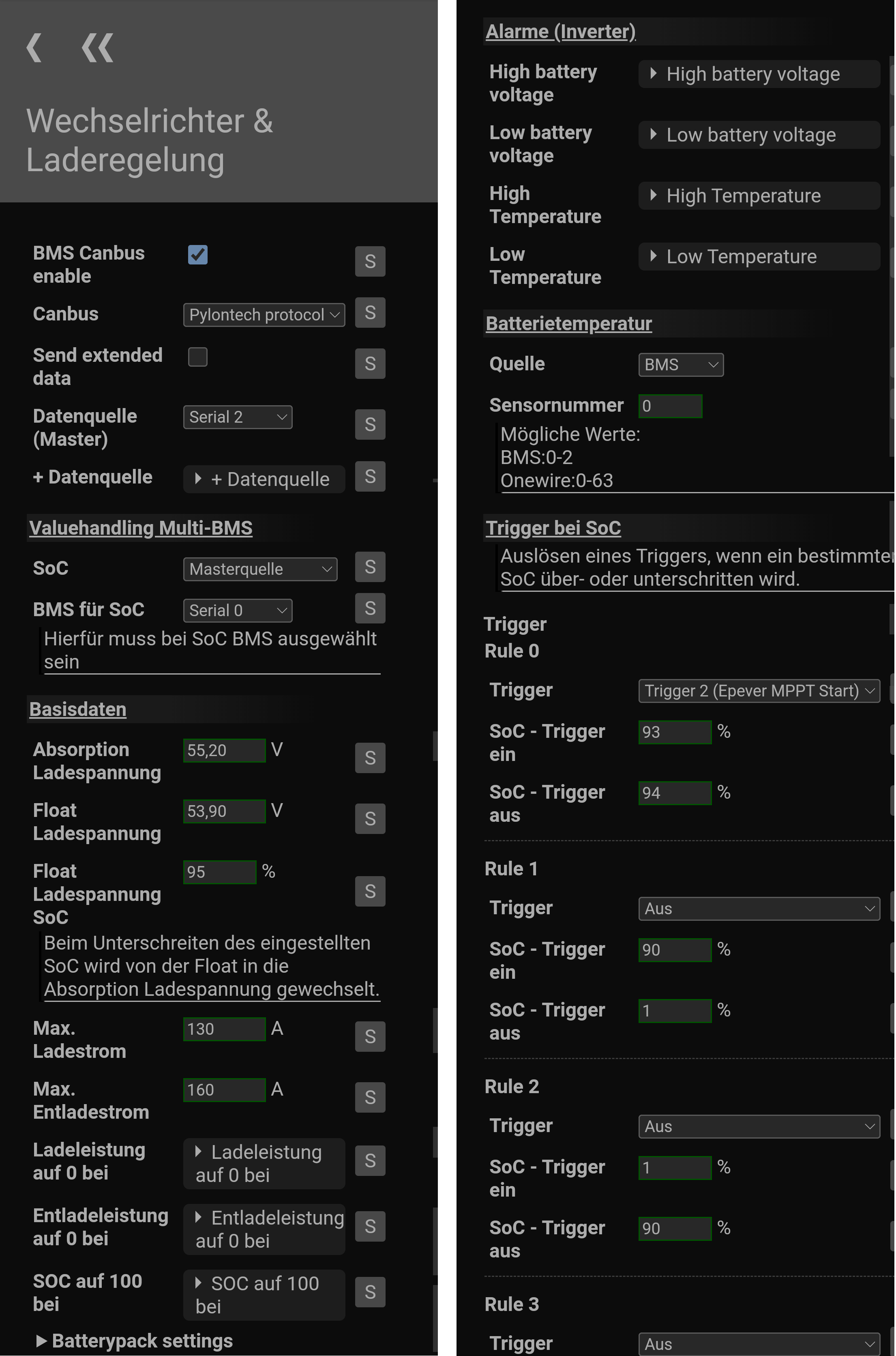 Wir raten dringend davon ab, die dargestellten Einstellungen unreflektiert zu übernehmen. Nehmen Sie sich die notwendige Zeit, die vorgeschlagenen Konfigurationen in ihrer Gesamtheit zu verstehen und sicherzustellen, dass sie für Ihre individuellen Anforderungen und Systeme geeignet sind. Eine unsachgemäße Anwendung kann zu Schäden an den Geräten, den Batterien oder sogar zur Gefährdung Ihrer Sicherheit führen.
