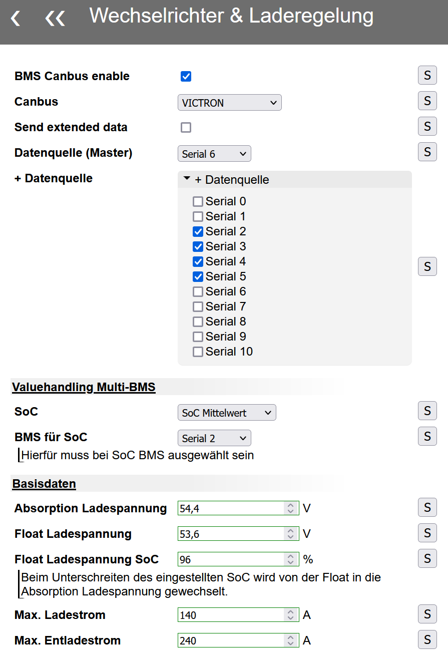 Serial 6 wurde hier als Datenquelle (Master) BMS gesetzt, da hier durch die höchste Position im Stack, die höchsten Temperaturen auftreten.