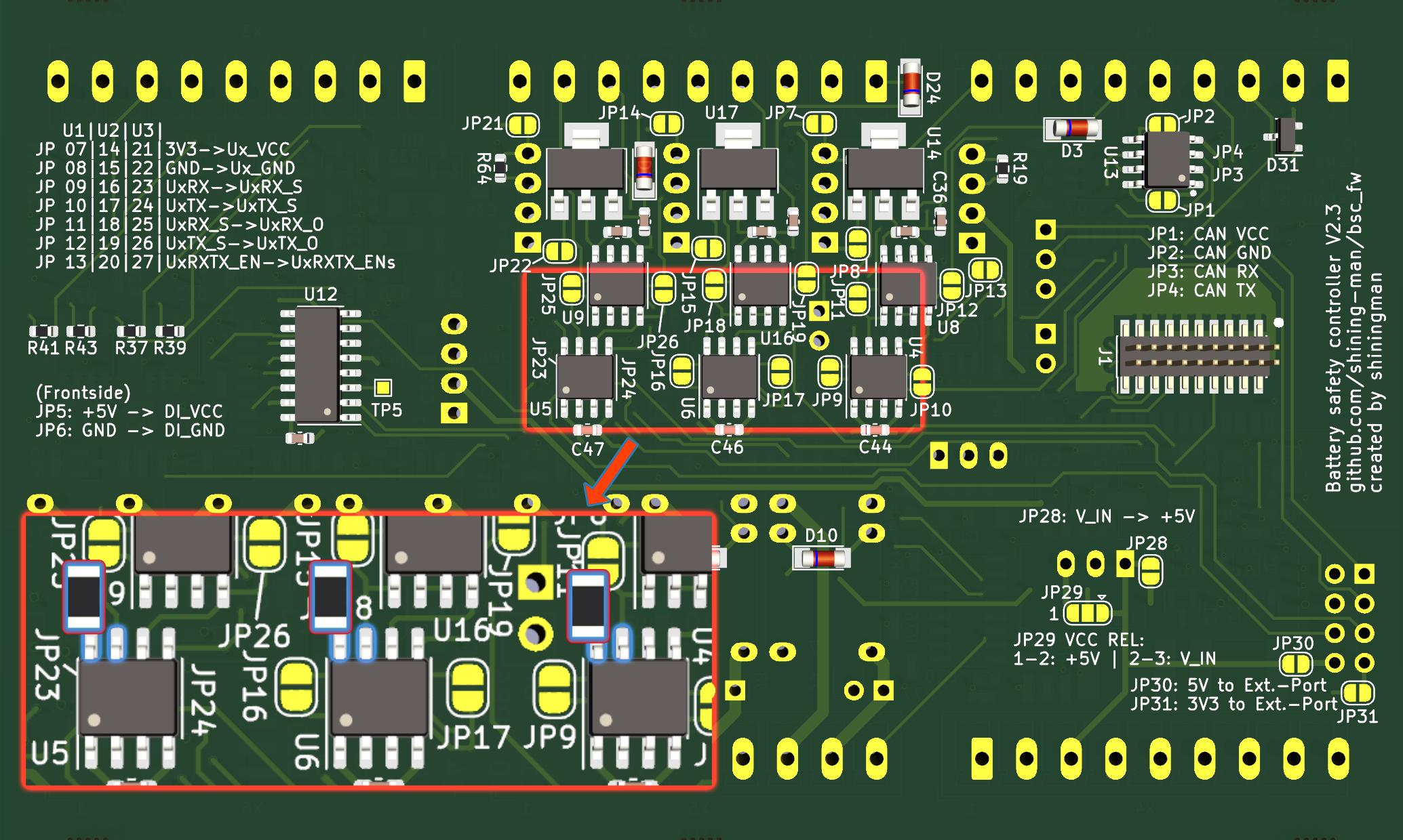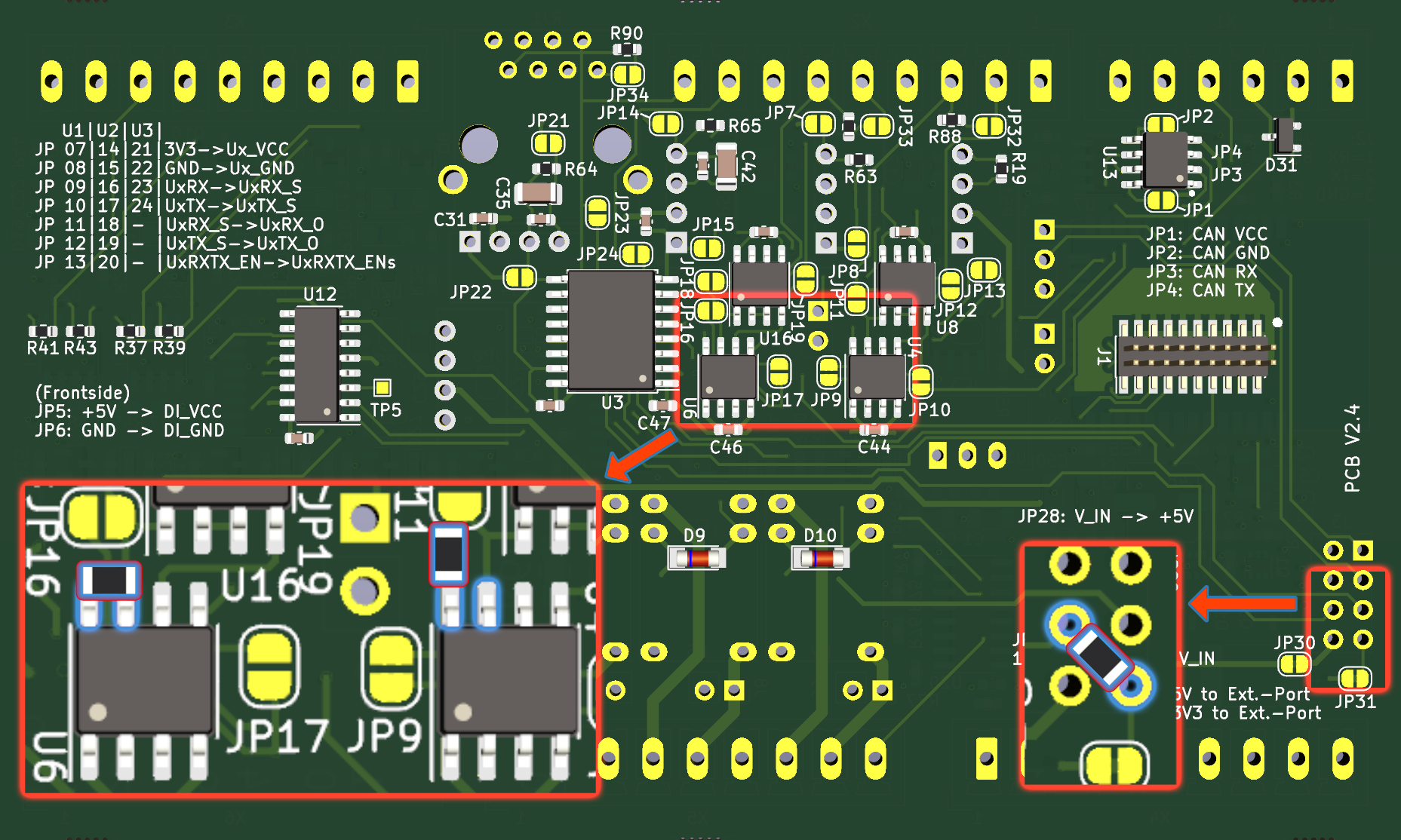 Der dazugehörige CAN_GND fehlt hier und muss daher auf der Leiterplatten-Unterseite über die Pins des Spannungsreglers abgegriffen werden.